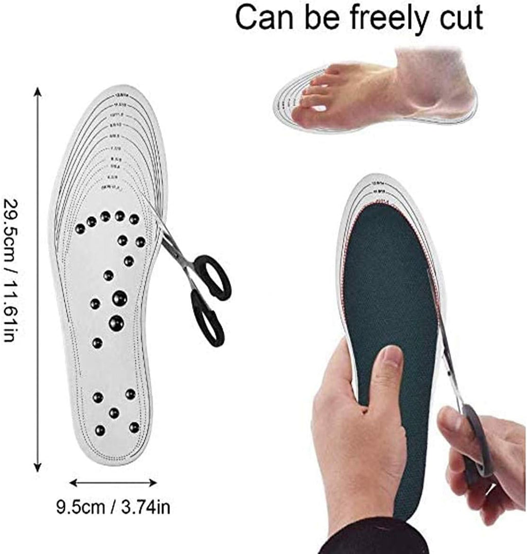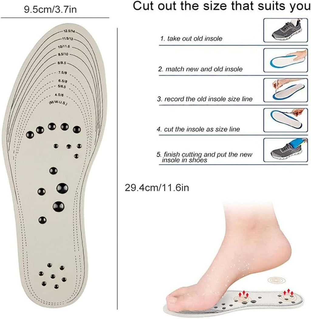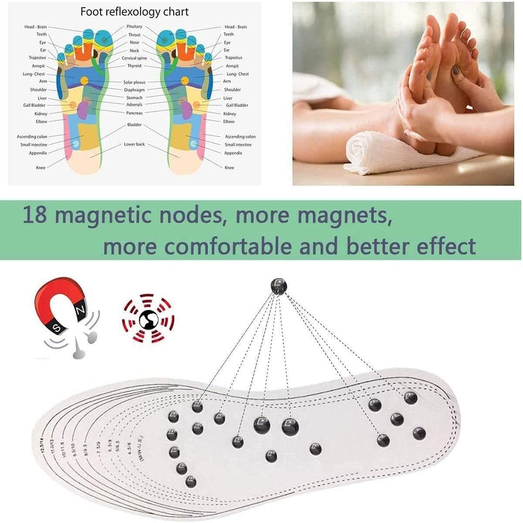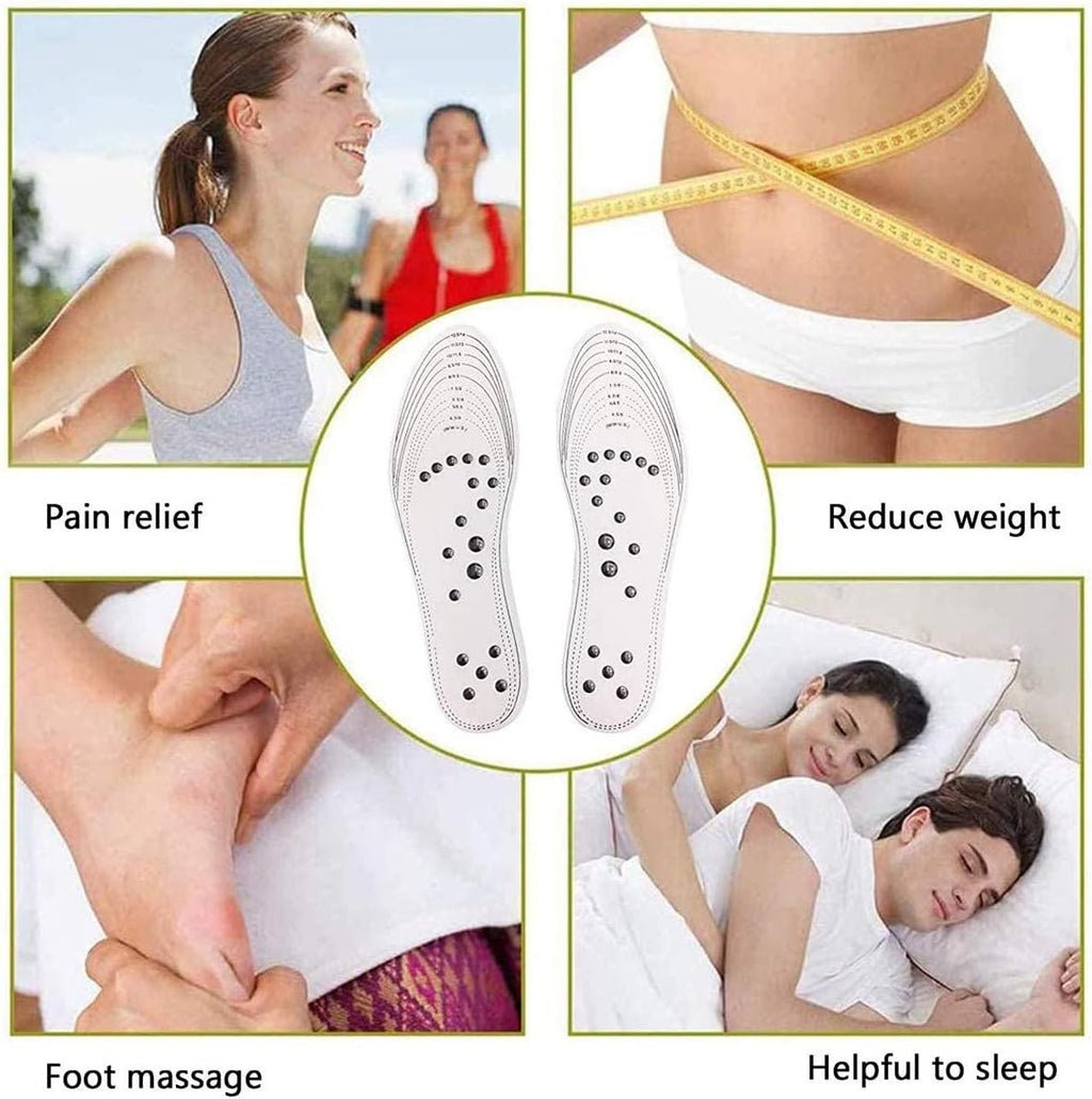 Talla de calzado: 35-45 (Universal, Ajustable/Recortable). Material: EVA, Algodón (Memory Foam), Fibra Grado A+. Espesor: 2MM (Diseño Delgado, no abulta). Imanes: 18 Puntos Magnéticos (Terapia de Reflexología). Lavable: Sí. / Recortable: Sí. Color: Blanco (Discreto).